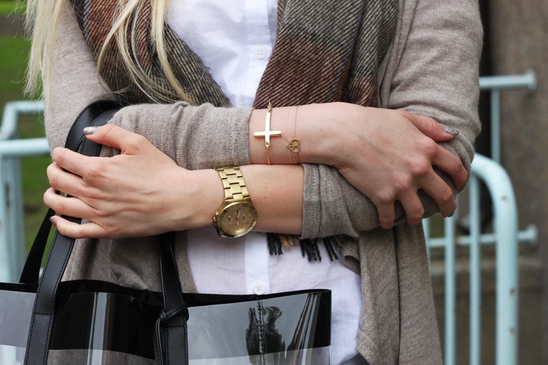 NEULE / SWEATER GINA TRICOT PAITAPUSERO / SHIRT H&M HUIVI / SCARF SEPPÄLÄ HOUSUT / PANTS CITYMARKET TENNARIT / SNEAKERS ADIDAS LAUKKU / BAG MICHAEL KORS KORUT / JEWELLERY GINA TRICOT KELLO / WATCH GUESS