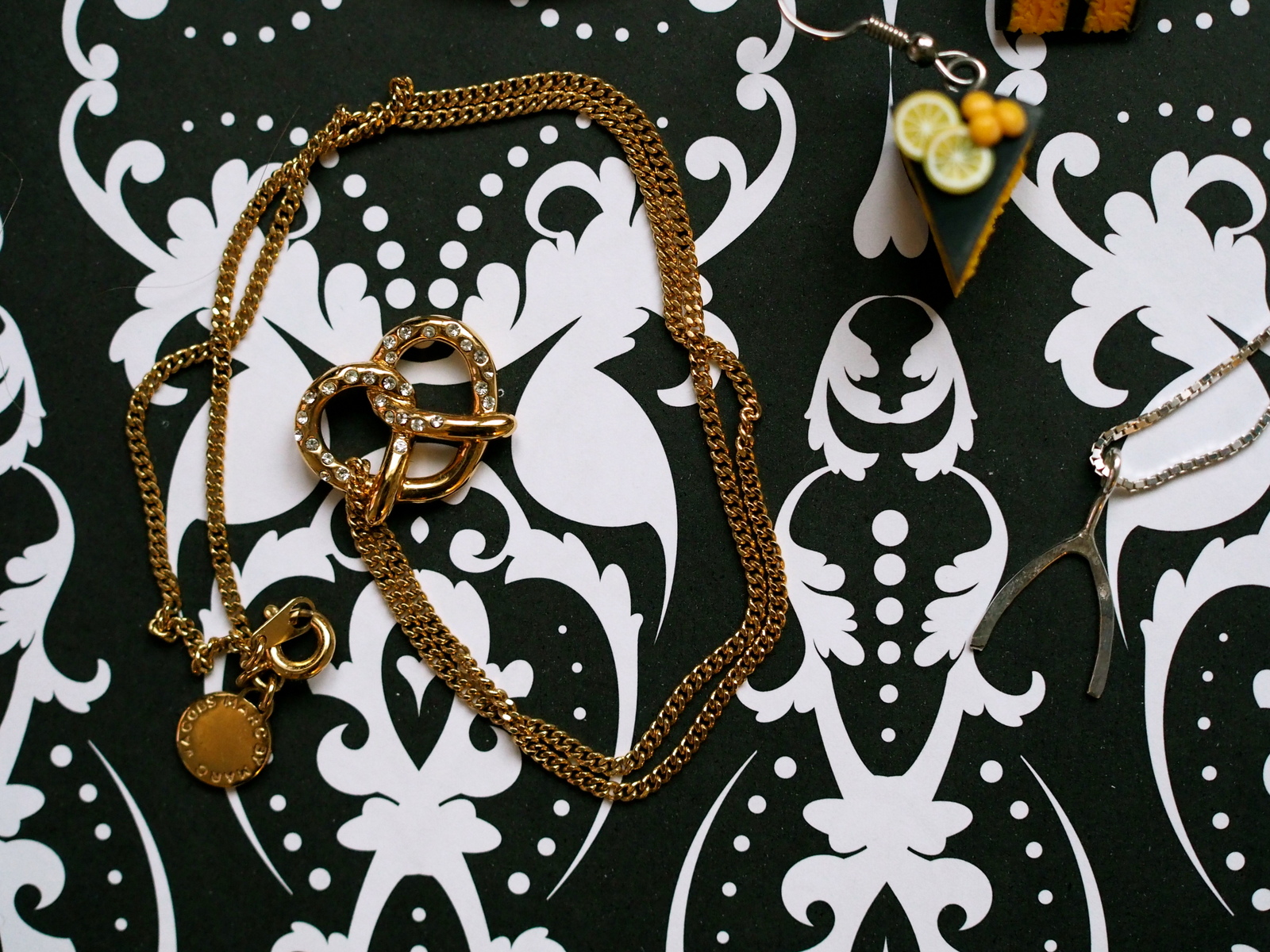 Tämänhetkiset lempparikorvikseni ovat Veeran tekemät. Maatuskapari kerää aina kehuja, kun ne killuvat korvissani ja Veera on onnistuvat tekemään isoista korviksista niin kevyet, että välillä unohdan niiden olemassaolon kokonaan niitä käyttäessäni. Herkkusuukorujen pikkutarkkuus ja täsmällisyys sai minut aivan sanattomaksi, kun näin nuo leivospalat ensimmäistä kertaa. Vau! Arvostan todella käsityötä ja nämä sitruunapiirakat aiheuttavat todellisen herkkuhampaan kolotuksen. Vastapainoksi näyttäville korviksille, kaulastani löytyy usein tuo Ideakorun hopeinen toivomusluu. Tämä koru taitaa tällä hetkellä olla lemppareistani se rakkain. Se on herkkä ja suloinen ja täydellinen arkenakin käytettäväksi. Marc Jacobsin rinkelikaulakoru on sen sijaan niin hauska idealtaan, että sekin kaulaltani usein löytyy. Riipus on pienenkokoinen ja juuri sopiva piristämään asuja.