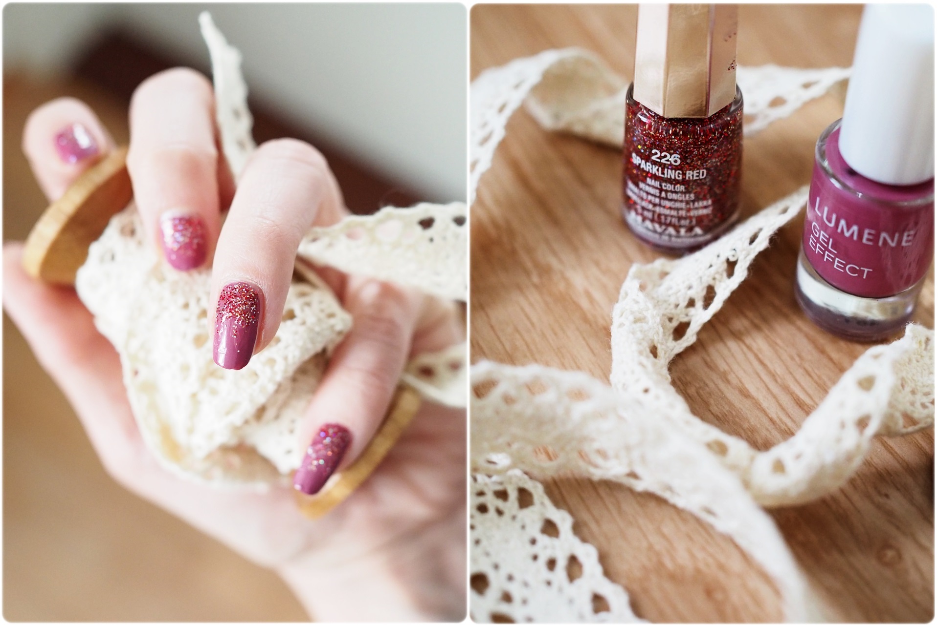 Säihkettä Apilaniitylle toi tällä kertaa lakka, jonka ostin Lontoosta venaillessani lentokentällä lentomme lähtöä. Mavalan hilelakoilla taikoo manikyyriin kuin manikyyriin säihkettä ja nämä hileet toden totta pysyvät paikoillaan. Joskus vähän liiankin tiiviisti. Sparkling Red sopi kuitenkin täydellisesti pariksi purppuraiselle aluslakalle ja otin sen riskin, että hilelakan poistaminen saattaa tuoda sitten jossain vaiheessa tuskanhikeä otsalle.
