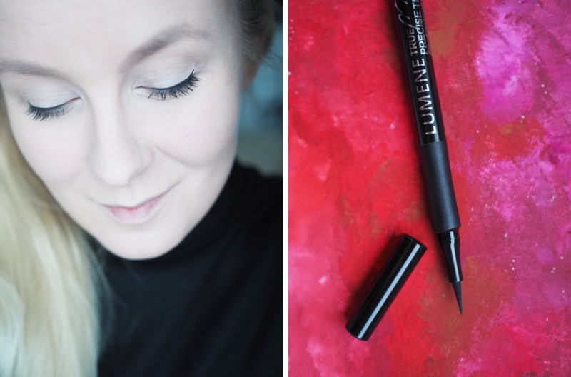 Joulunaikaan testailin jo Lumenen uutta, mystistä ripsiväriä, mutta enpä osannut aavistaa, millaisen megakombon uutuusripsari ja nestemäinen silmänrajaustussi muodostaisivatkaan. Silmänrajaustussin (n. 12,90€) viimeistellyllä, joustavalla päällä, saa piirrettyä hurjan tarkat rajaukset, jotka säilyvät luomilla pitkänkin päivän kestäen jopa purevasta pakkasesta aiheutuneet kylmänkyyneleet. Tussi ei tahraa ja rajaus kuivuu nopeasti. Meikkipussini onkin nyt viime aikoina muodostunut melko mystiseksi, kun sekä ripsiväri että rajauskynä ovat vaihtuneet näihin Lumenen True Mystic-uutukaisiin.