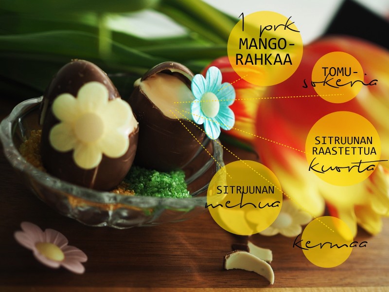 Pääsiäisherkun (tai vaikka ihan vaan arkisen torstaiherkun..) sisus valmistetaan vispaamalla ensin noin 1 ½ dl kermaa. Toisessa astiassa sekoitetaan yhteen purkillinen mangorahkaa ja sitruunan kuorta. Mukaan lisätään ½ dl tomusokeria ja 1 ½ rkl sitruunan mehua. Kerma ja rahkaseos yhdistetään ja sekoitetaan tasaiseksi mousseksi.